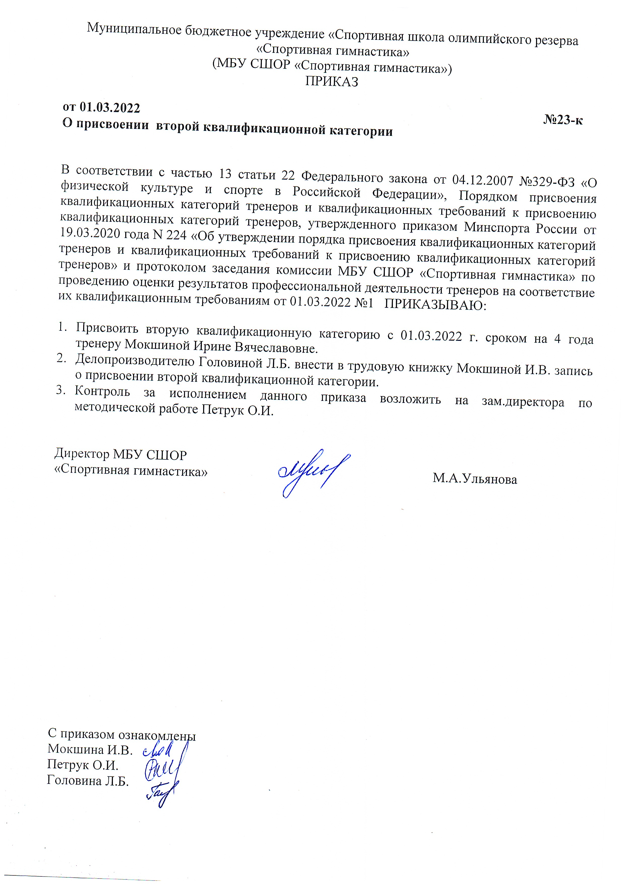 Приказ о присвоении 2 квалификационной категории